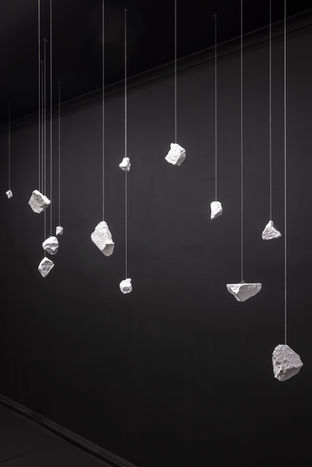 菲尔顿作品的核⼼在于记录转变的瞬间时刻——艺术家既是创造者⼜是破坏者,切断了将⽩ 垩岩拴在天空上的线。这⼀⾏为让⼈想起塑造宇宙的宇宙现象,引发了天体的垮台,下⾯⿊ 纸上的每块岩⽯破碎不仅标志着⼀个结束,也标志着⼀个新星座的开始。这个天体瀑布的残 余物,在⿊暗的地板上撒上⼀层明亮的粉笔,描绘了⼀幅从毁灭中诞⽣的恒星制图,凄美地 提醒⼈们塑造所有存在的创造和毁灭的循环。