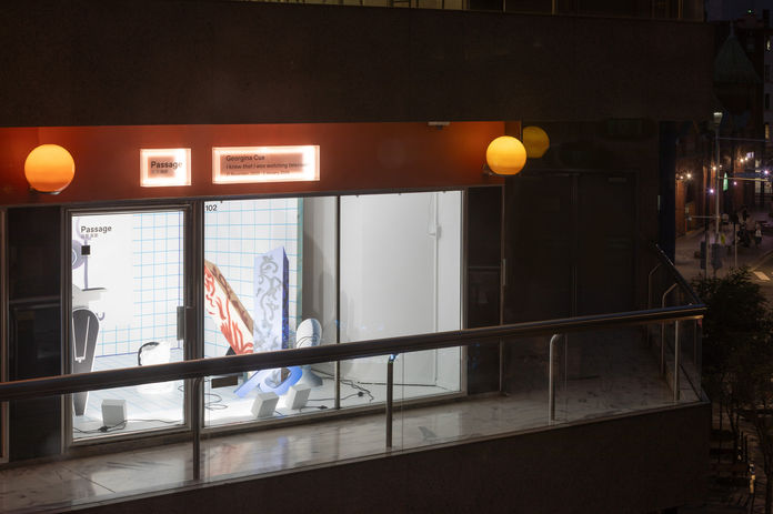 乔治娜·库伊(Georgina Cue)是一位艺术家兼教师,长期深入思考历史、舞台设计与摄影艺术。《我意识到自己正在看电视》(I knew that I was watching television)通过电影般的舞台布景展现了这些兴趣,其中暗合西方艺术史的若干关键时刻——例如文艺复兴时期的建筑绘图、包豪斯剧院设计以及笛卡尔坐标系。